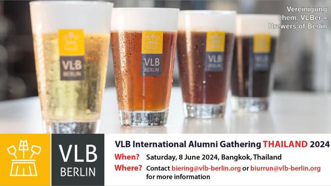 A "VLB international Alumni and Members Gathering" hosted by the Vereinigung ehem. VLBer – Brewers of Berlin will be held in Bangkok, Thailand, on Saturday, 8 June 2024. In order get the information about the venue and the exact time, please contact Jan Biering (see below).