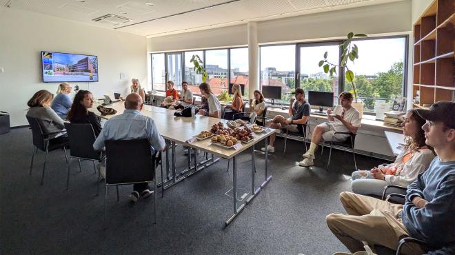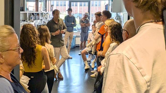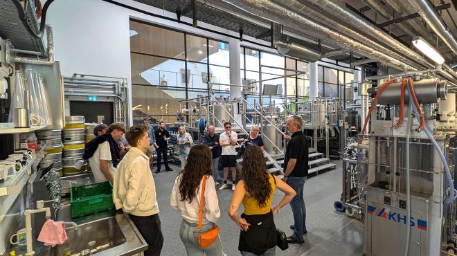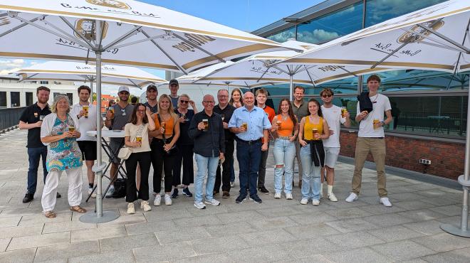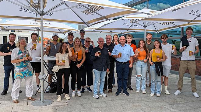 Die Gruppe bestand aus 13 Familienmitgliedern im Alter von 18 bis 30 unter der Führung von Dr. Matthias Beggerow, dem Sprecher des Familienrates der Unternehmerfamilie Simon. Die VLB-Geschäftsführer Dr. Josef Fontaine und Gerhard Andreas Schreiber stellten kurz die VLB vor und hoben dabei die mehr als 120-jährige enge Beziehung des Berliner Instituts zur Bitburger Brauerei hervor. Nach einem kurzen Rundgang durch einige Labore, das Wilfried-Rinke-Brauerei-Technikum und die Axel-Simon-Bibliothek endete der Besuch auf der Bitburger-Dachterrasse mit einem gemeinsamen frischen Bitburger-Pils.